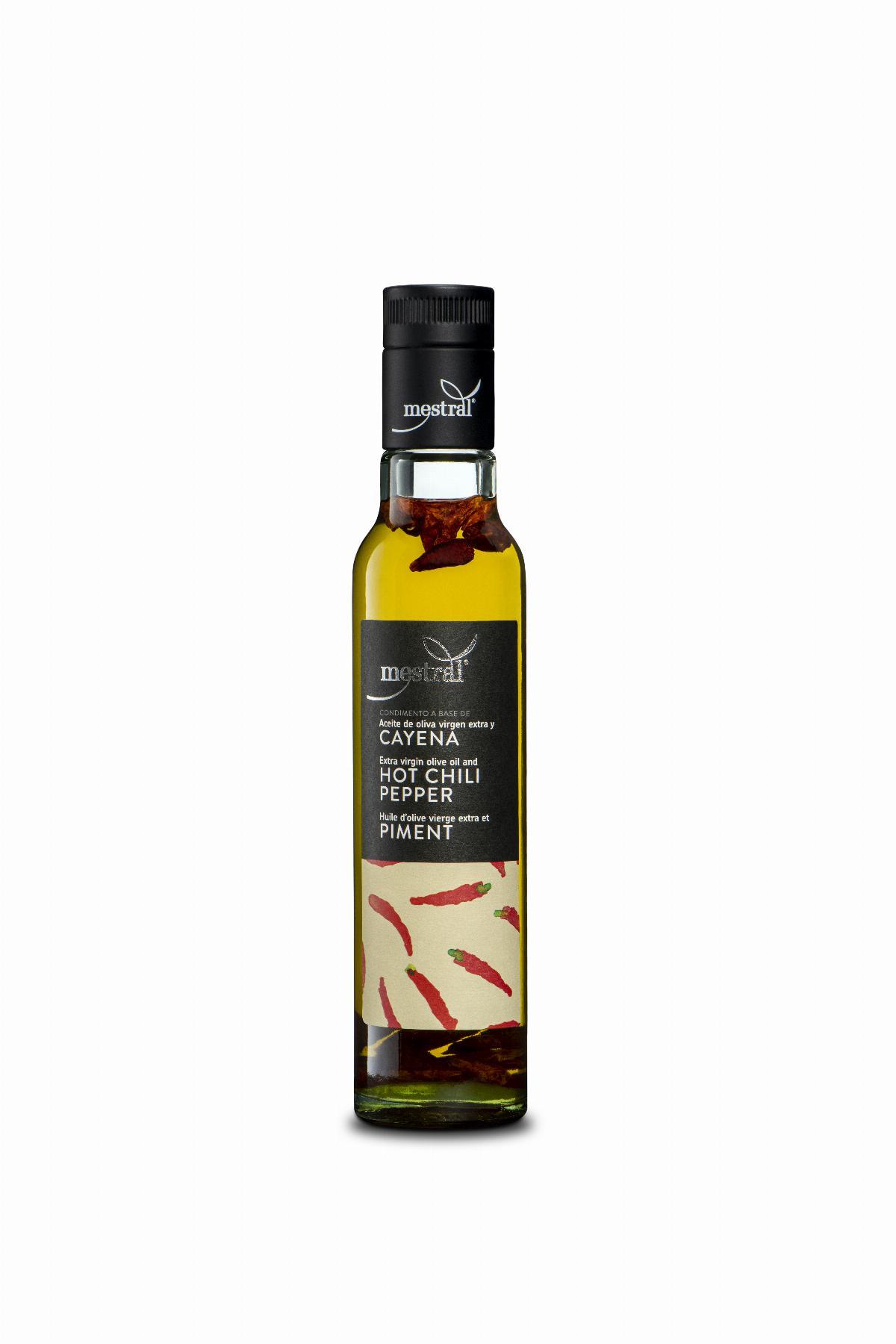 Aceite de oliva virgen extra infusionado con cayena (picante). Auténtico condimento para la cocina del siglo XXI. Línea de condimentos elaborados con aceite de oliva virgen extra de la variedad arbequina macerados con ingredientes de primera calidad.