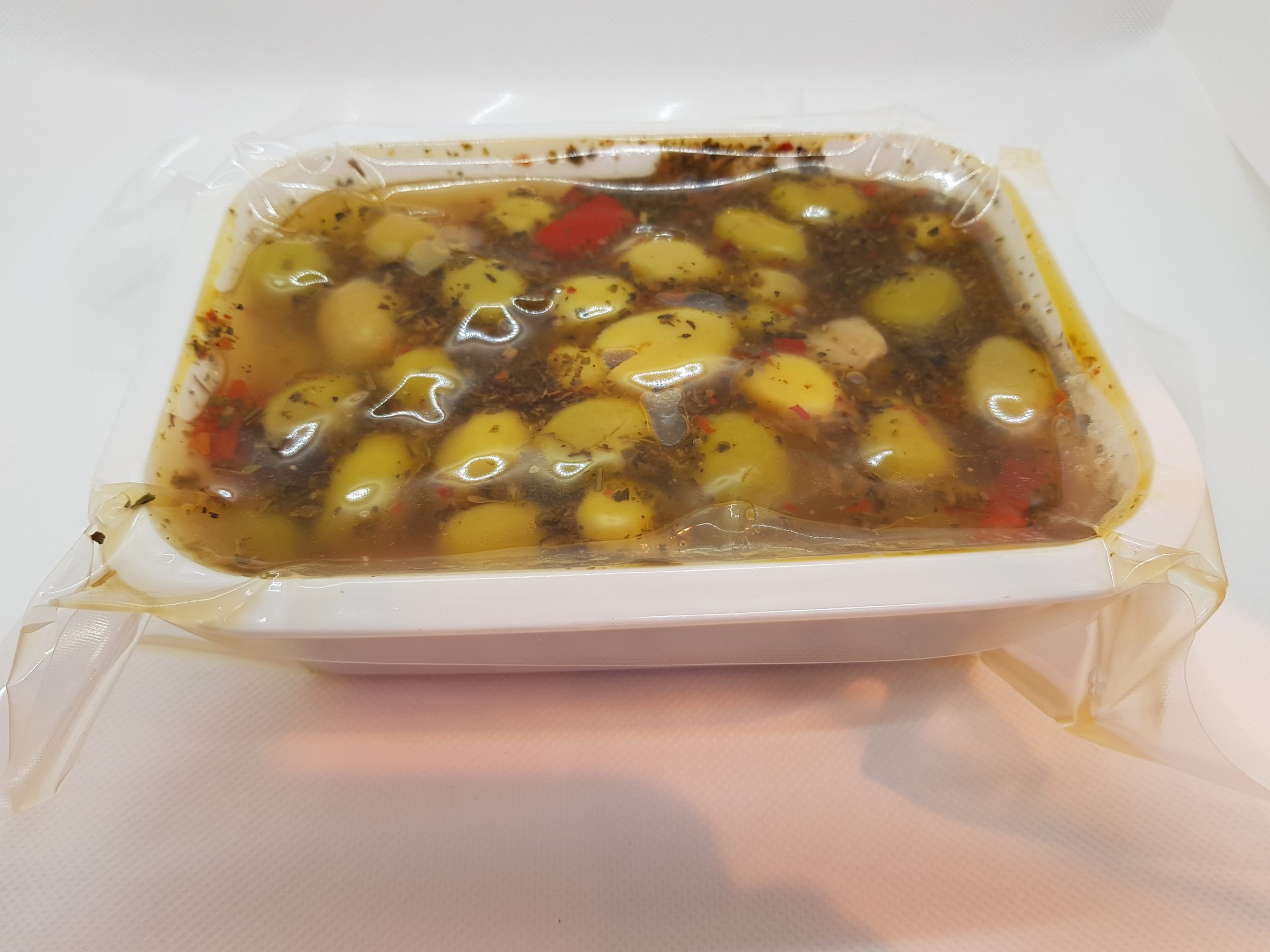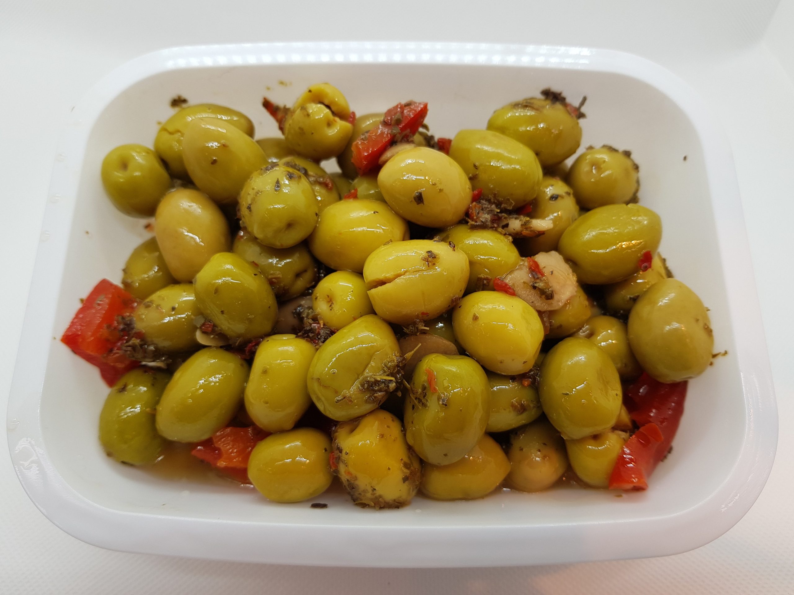 Aceitunas partidas con hueso Aderezadas con pimiento , guindilla , piri-piri , peperoncino , vinagre y especies.