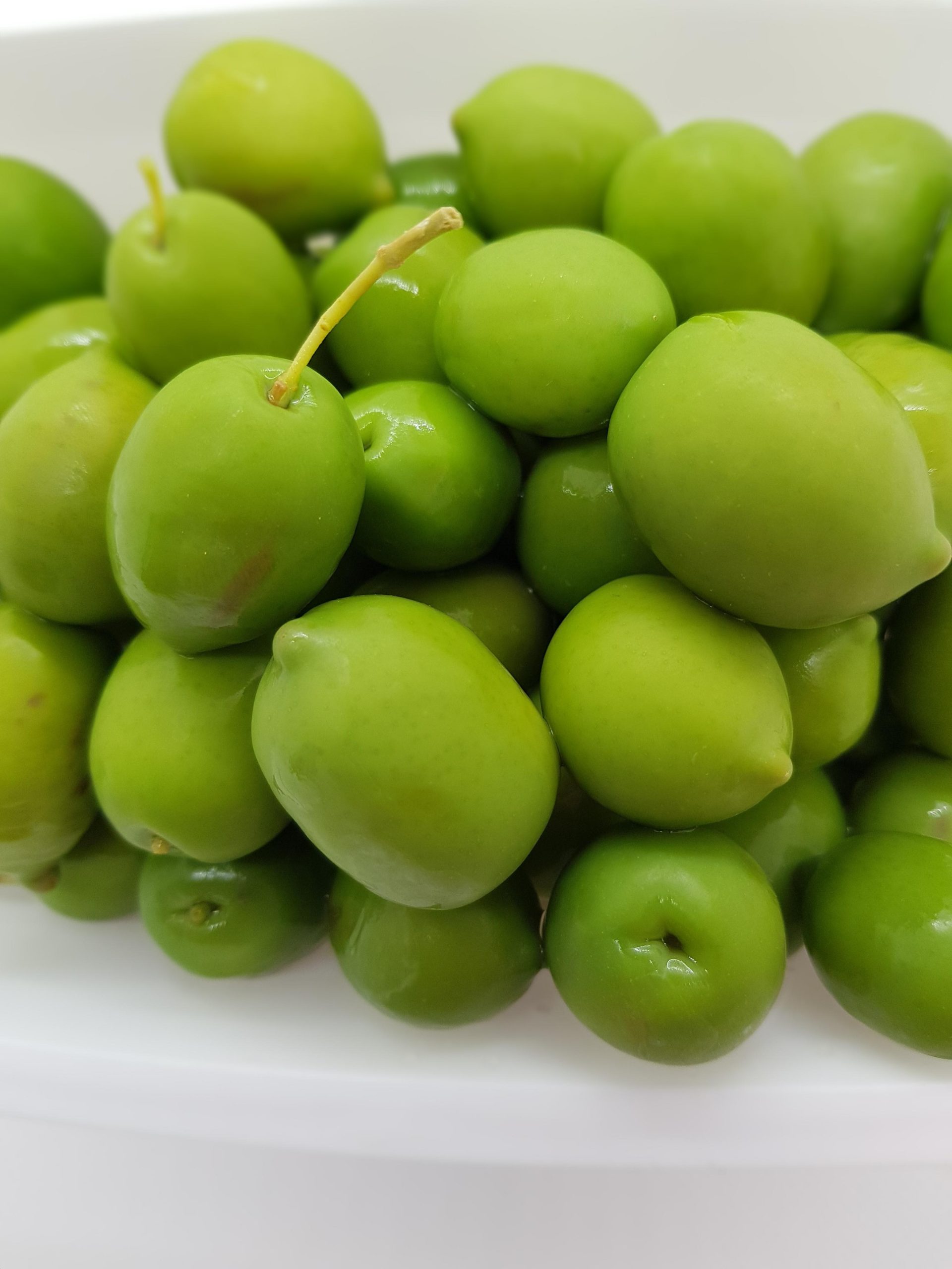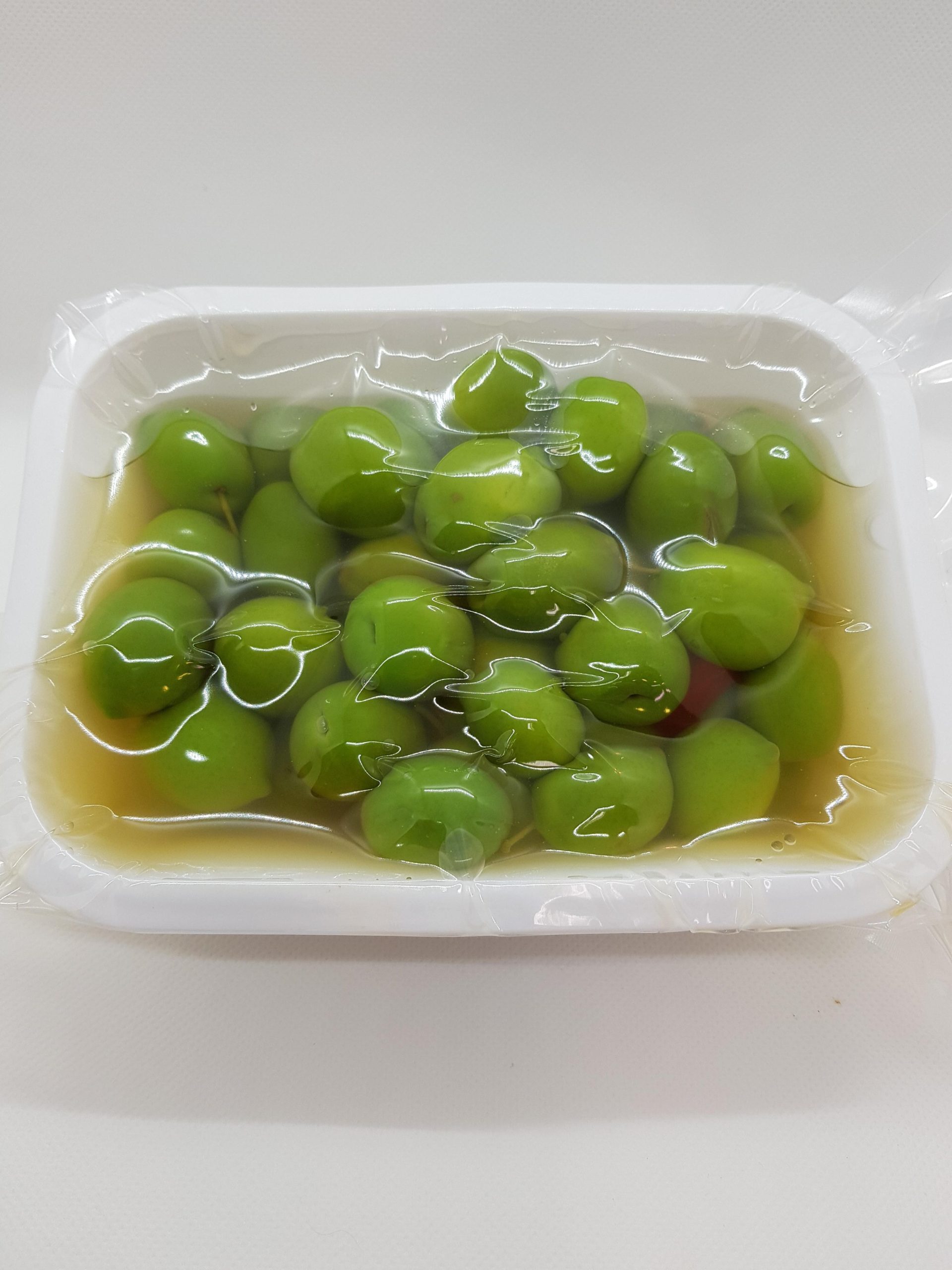 Aceituna recién cogida del árbol con un intenso color verde. Su sabor es dulce, suave, con muy poca sal y con un toque de limón.