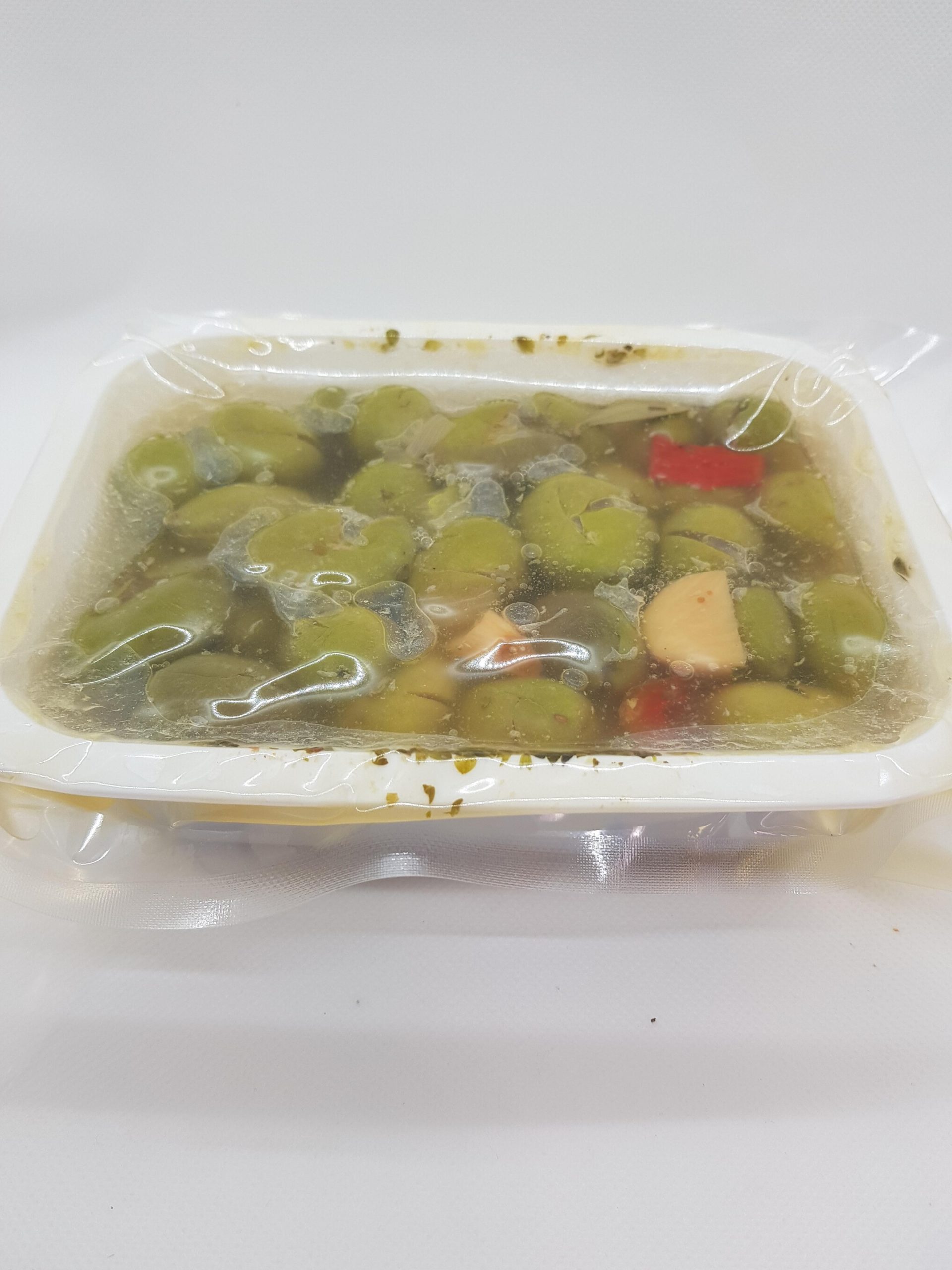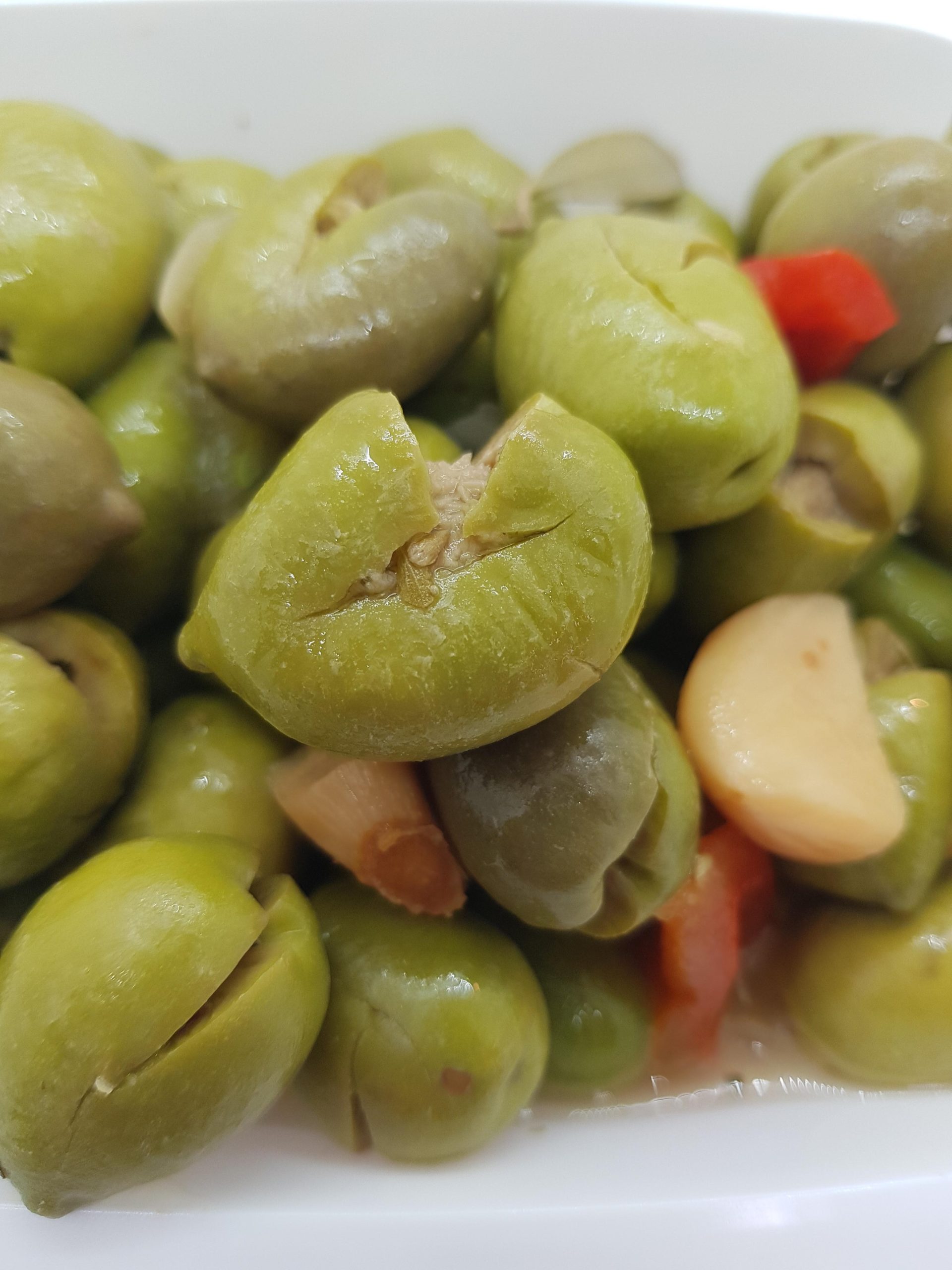 Aceitunas de Jaén partidas aliñadas. Es una aceituna verde carnosa y firme de un sabor ligeramente amargo. Se aliña con ajo pimiento y especies.
