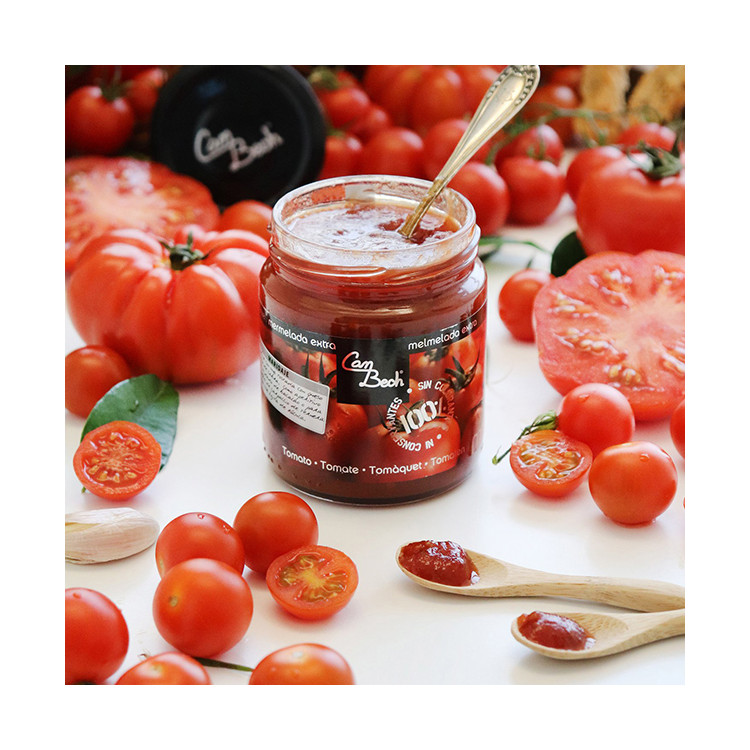 La mermelada de tomate es una especialidad española, elaborada con tomates maduros de la región de Murcia. Elaboramos esta mermelada solo en verano, cuando los tomates son buenos y maduros, y así conseguimos de manera natural este fantástico color rojo.