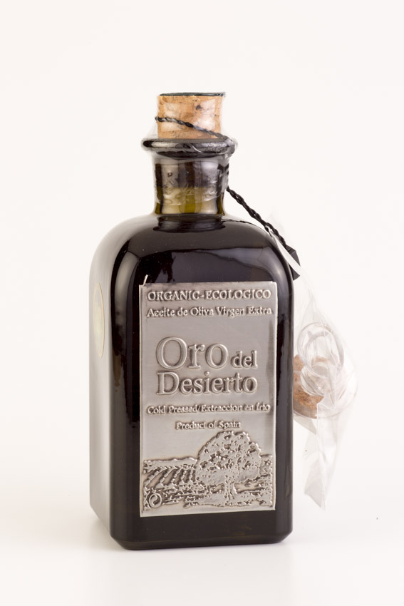 Aceite de oliva virgen extra ecológico Oro del Desierto. 250 ml. Elaborado con las variedades Picual, Hojiblanca y Arbequina.