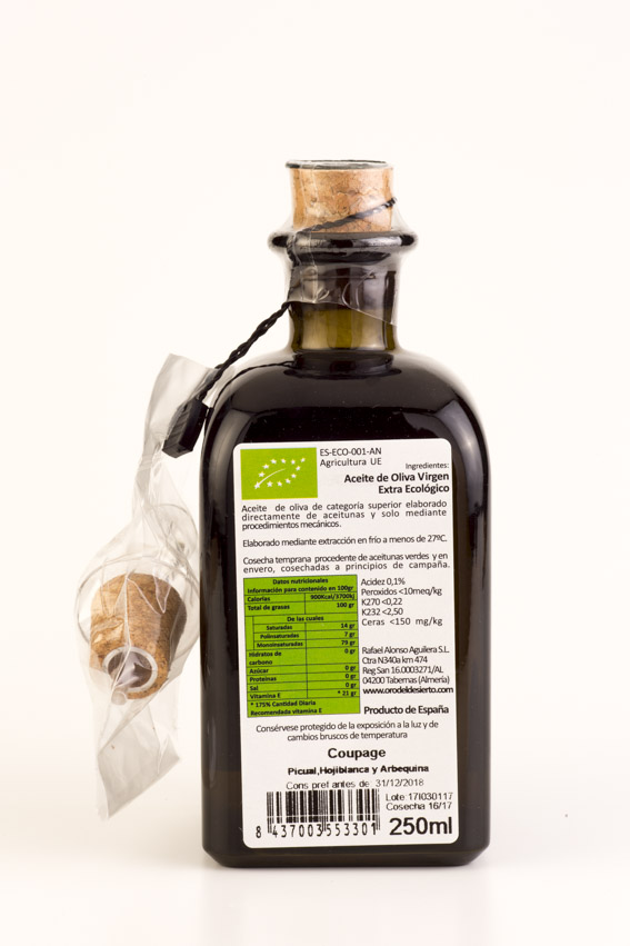 Aceite de oliva virgen extra de cultivo ecológico Oro del Desierto 250 ml. Extracción en frio. Elaborado con las variedades Picual, Hojiblanca y Arbequina. Envasado en botella de cristal. Origen: Almeria.