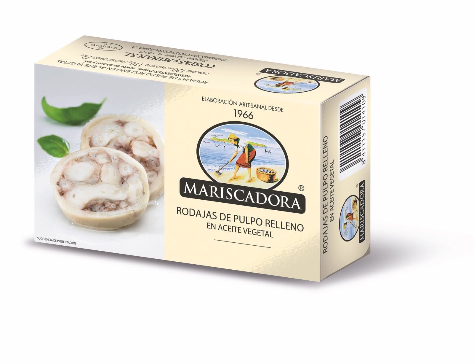 Rodajas de pulpo relleno aceite vegetal. Mariscadora RR-120 Pak de 4 latas.