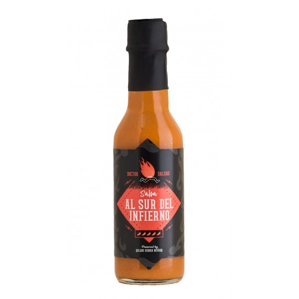 Al Sur del Infierno,salsa super picante está hecha de forma artesanal en Sierra Nevada (Granada). De una receta secreta con orígenes en California (esta salsa es la bomba!) no deja de ser muy sabrosa, hecha con mucho habanero fresco tipo Red Savina, habanero seco en polvo, y un toque de extracto de capsaicina de India, mucho ajo, cebolla, zanahoria, y zumo de limón fresco.