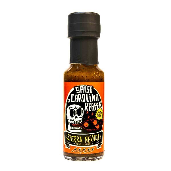 Esta salsa lleva el poderoso Carolina Reaper, el chili mas picante del mundo. Con jalapeños asados, cebolla, ajo, vinagre de sidra, zumo de limón y sal marina bio tiene un punto de dulzor y asado, con tonos cítricos. La botella de 100 ml esta apto para llevar en tu bolso, y llevarlo por avión.