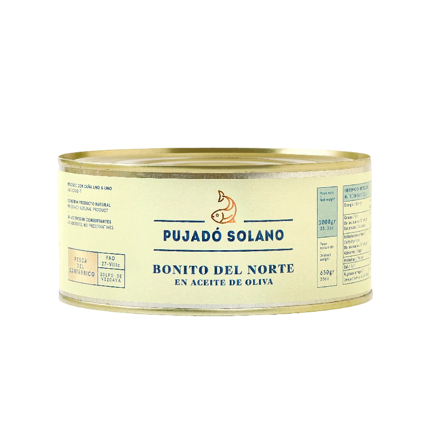 Lata de bonito del norte de costera, envasado en aceite de oliva, 1000 g. Perfecto para compartir en comidas familiares, ideal para ensaladas, platos de pasta o como aperitivo.